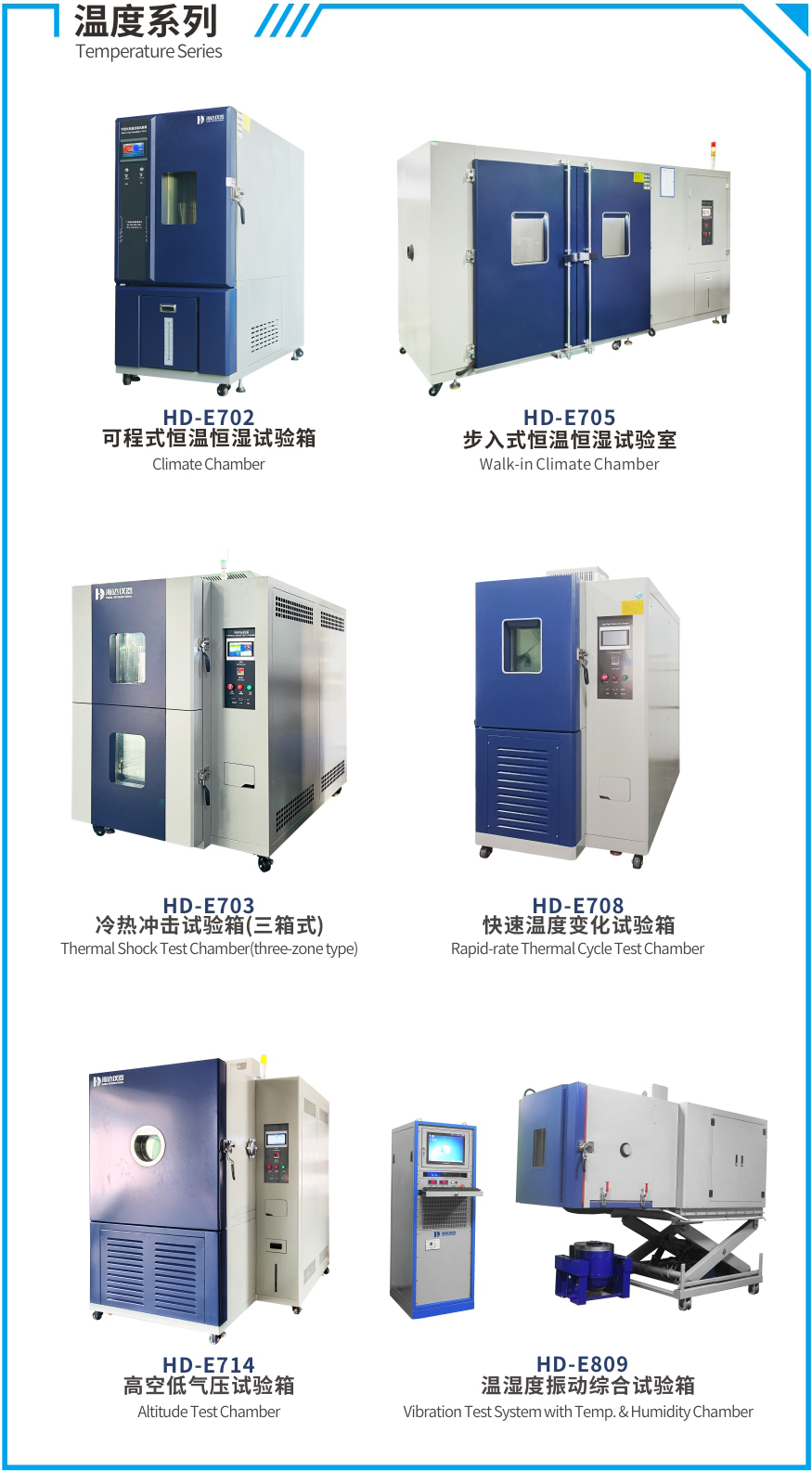 溫度系列試驗:恒溫恒濕試驗箱、冷熱沖擊試驗箱、高空低氣壓試驗箱、溫濕度振動綜合試驗箱等檢測儀器可模擬極端氣候,以驗證材料穩定性。